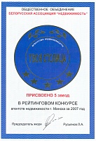 В 2007 году Общественное объединение "Белорусская ассоциация "Недвижимость" присвоило компании 5 звезд в рейтинговом конкурсе агентств недвижимости г. Минска за 2007 год (1 место)