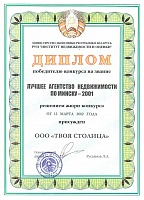 По итогам 2001 года решением РУП "Институт недвижимости и оценки" при Министерстве экономики Республики Беларусь агентству недвижимости "ТВОЯ СТОЛИЦА" было присвоено звание "Лучшее агентство недвижимости г. Минска"