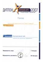 Первое место в номинации "Строительство, архитектура, недвижимость" среди зарубежных сайтов и почётное второе место в этой же номинации среди всех сайтов, принимавших участие в престижном российском конкурсе "Золотой сайт 2007"