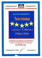 Гран-при за достижение наивысших результатов на Рейтинговом конкурсе среди агентств недвижимости г. Минска, проводимом Белорусской ассоциацией "Недвижимость"
