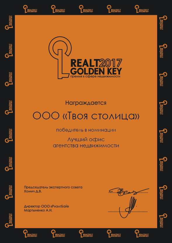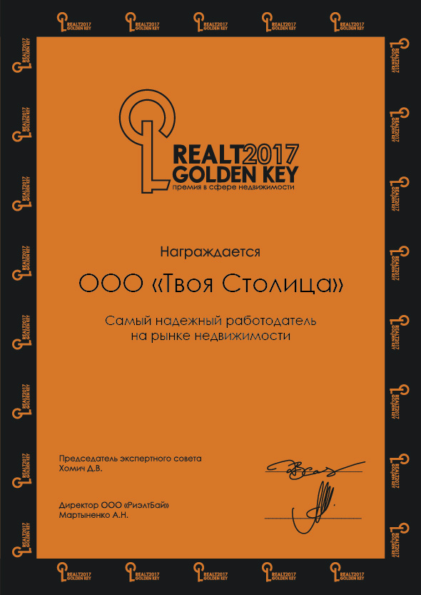 "Realt Golden Key" 2017 в номинациях:Риэлтерская организация года. Количество специалистов по риэлтерской деятельности 50+