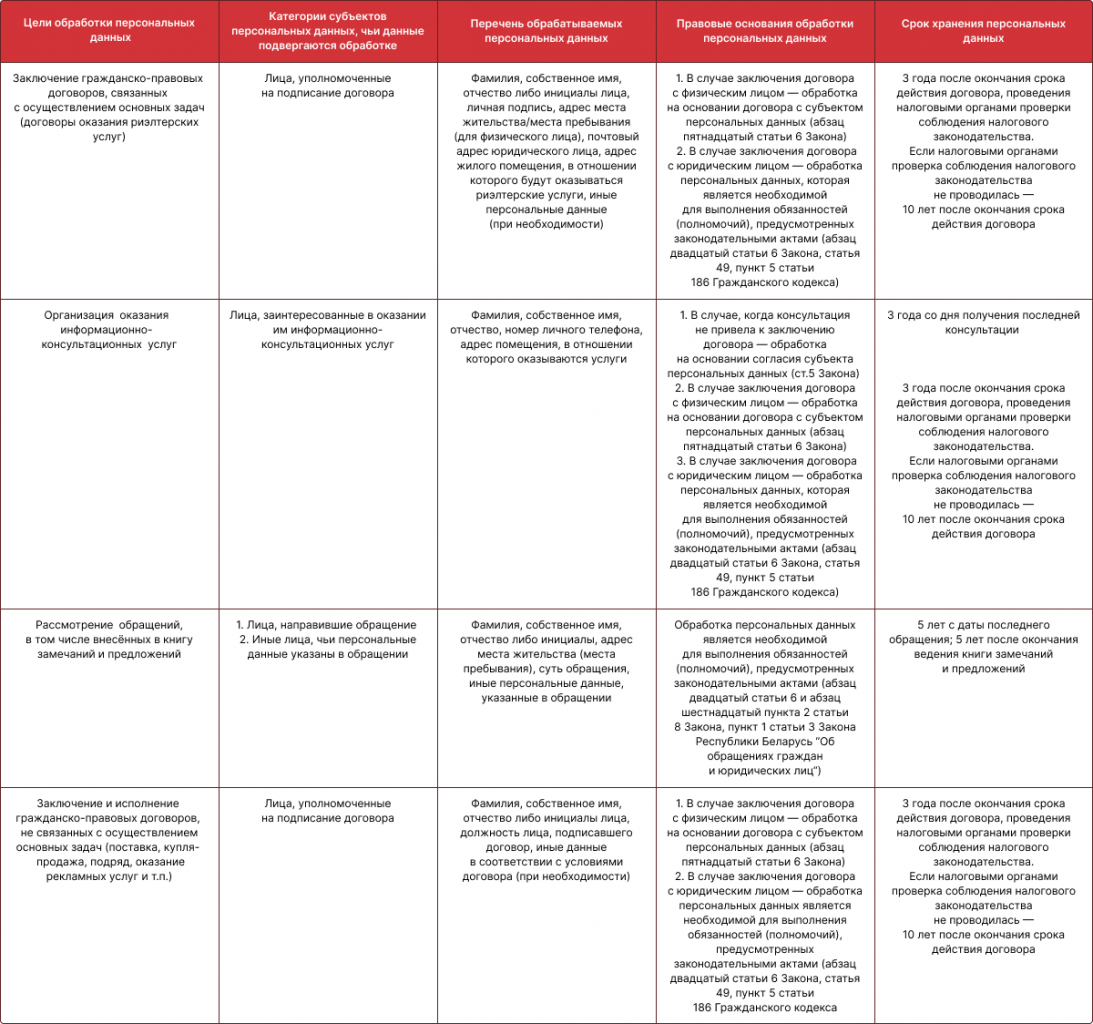 1. При обращении в Организацию за оказанием информационно-консультационных услуг без заключения договора – обработка на основании согласия субъекта персональных данных (ст.5 Закона) 2. В случае заключения договора с физическим лицом – обработка на основании договора с субъектом персональных данных (абзац пятнадцатый статьи 6 Закона) 3. В случае заключения договора с юридическим лицом – обработка персональных данных, которая является необходимой для выполнения обязанностей (полномочий), предусмотренных законодательными актами (абзац двадцатый статьи 6 Закона, статья 49, пункт 5 статьи 186 Гражданского кодекса) |