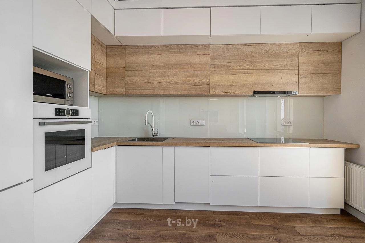 Встроенная кухня сделана из качественных материалов с фурнитурой Blum. Установлены верхние шкафчики-антресоли для дополнительного хранения вещей. Подключены посудомоечная машина, духовой шкаф и индукционная поверхность фирмы Bosсh, встроенная вытяжка, микроволновка, холодильник Siеmens.