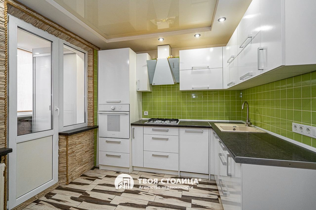 • Встроенная кухонная мебель с необходимой техникой: посудомоечная машина, вытяжка, газовая варочная панель и духовой шкаф.