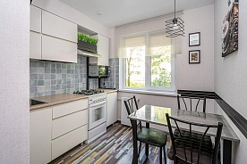 Стеклопакеты ПВХ. Лоджия застеклена раздвижными алюминиевыми рамами. Полы - ламинат, Межкомнатные двери МДФ. Встроенная кухня. Газовая плита. В ванной комнате современная плитка. Инсталляция. Полотенцесушитель.