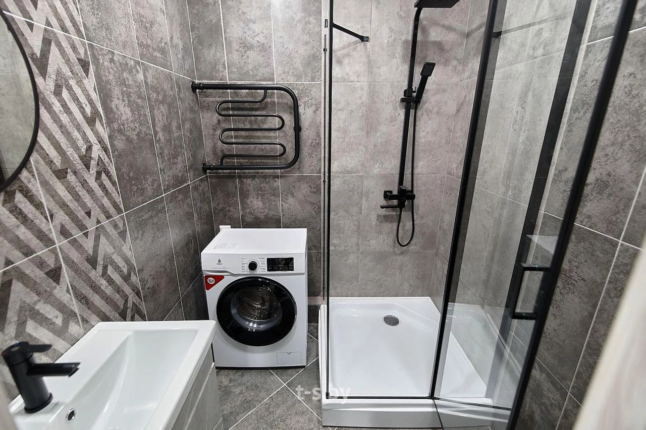 ванна и санузел облицованы современной керамической плиткой и оборудованы сантехпосудой, душевая кабина в ванной;