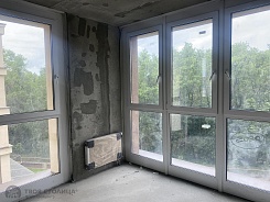 Квартира свободной планировки с панорамными окнами и видом на парк.