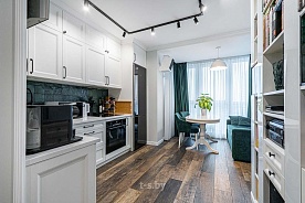 Кухня – сочетание современного стиля и функциональности. Кухонная зона со встроенной мебелью укомплектована бытовой техникой: варочная панель, вытяжка, духовой шкаф, печь СВЧ, холодильник (Bosch).