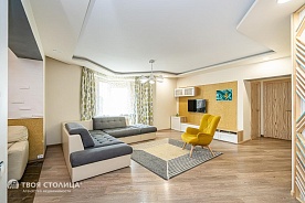 В квартире выполнен современный ремонт с использованием качественных материалов. Встроенная кухня с бытовой техникой. В оконных проёмах установлены стеклопакеты с профилем из ПВХ, в том числе на лоджии. Напольное покрытие: плитка, ламинат. Два санузла облицованы кафелем современного дизайна.