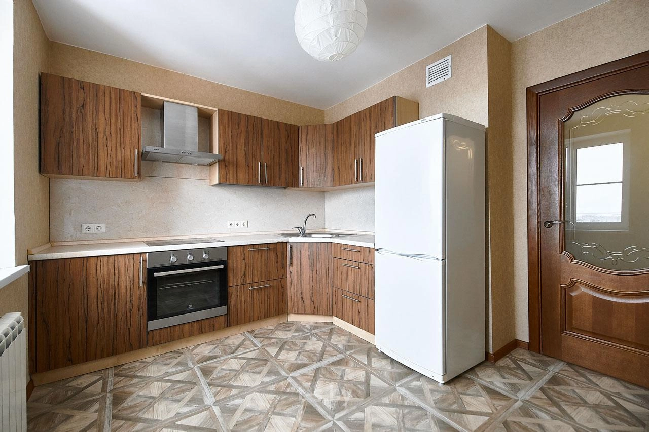 Из окон 25 этажа каркасно-блочного дома открывается панорамный вид на микрорайон. Встроенная кухня с бытовой техникой (электроплита Electrolux, вытяжка, холодильник). В санузлах плитка.