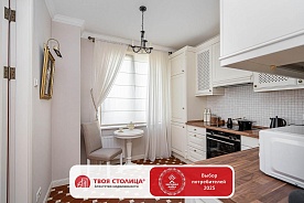 Аналогичный подход использовался для кухонной мебели: нарядность кухни подчёркивается столешницей цвета красного дерева, а фартук выложен мозаикой кофейного цвета. Кухонный гарнитур угловой. В нём разместилась основная встроенная техника: холодильник, духовка, плита на 4 конфорки, вытяжка и посудомойка. Пространство получилось максимально открытым, удобным и функциональным: ничего не мешает готовить и перемещаться по кухне.