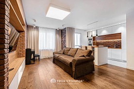 Детально продумана встроенная система хранения. Санузел облицован плиткой современного дизайна, оснащен сантехпосудой и фурнитурой импортного производства: ванна с тропическим душем, подвесной унитаз с инсталляцией, тумба под умывальник с подсветкой. Гостиная с обеденным островком. Отсюда выход на лоджию. Рабочая поверхность со встроенной техникой и фильтрами воды. Человек умеющий и любящий готовить оценит эргономику. Кухня оборудована современной и высококачественной техникой: духовой шкаф, индукционная варочная панель, посудомоечная машина, печь СВЧ - ВОSCH, холодильник - Liebherr, скрытая вытяжка . Французское остекление в пол, в т.ч. на лоджии. Напольное покрытие - паркет и плитка. В санузле и кухонной зоне подключена система теплый пол. Отделка стен выполнена декоративным камнем, штукатуркой и деревом. По всей квартире грамотная разводка электричества. Всё очень современно, качественно и комфортно!