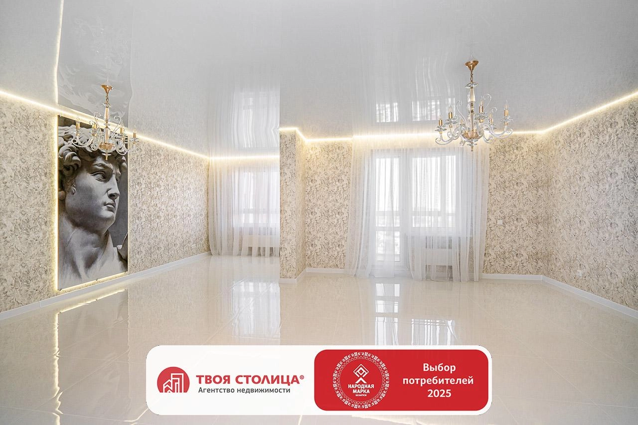 Выполнен качественный ремонт с применением отделочных материалов. Парящие натяжные потолки с подсветкой в комбинации с классическим светом. Предусмотрена отдельная подсветка штор. Напольное покрытие: ламинат, кафельная плитка. Подключена система "теплый пол". Стеклопакеты с профилем из ПВХ, французское остекление лоджий из которых можно наслаждаться видом на город с высоты птичьего полёта. На стенах итальянские обои Carrara. В гостиной зоне установлены декоративные колонны из полиуретана, а также панно из керамогранита. Межкомнатные двери из массива, входная металлическая. В санузлах итальянская плитка. Установлены унитаз, ванна, мебель для ванной комнаты, сантехническая посуда и оборудование от ведущих профильных производителей, некоторая мебель выполнена на заказ. Установлены современные радиаторы отопления, приборы учета воды, электро- и теплосчетчики, оптоволоконная связь.