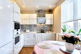 Встроенная кухня со столешницей и мойкой из искусственного камня, установлен кран с системой очистки питьевой воды. Встроенная бытовая техника ( индукционная варочная панель, духовой шкаф, микроволновая печь) производства Bosch, вытяжка Тека.