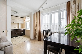 Ремонт выполнен с использованием качественных материалов. Полы паркет, плитка. Стеклопакеты ПВХ. Оборудованная гардеробная, функциональные шкафы-купе.