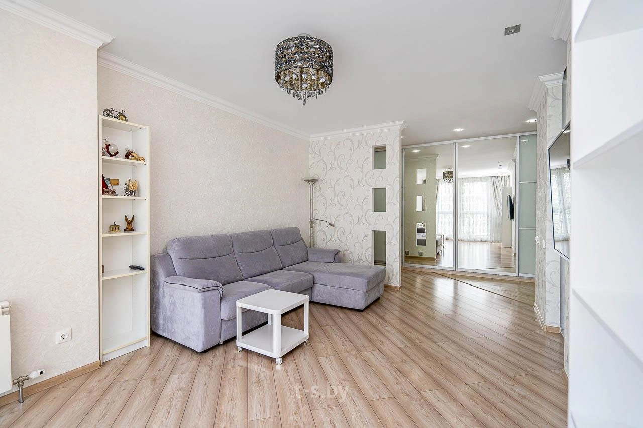 Напольное покрытие ламинат и плитка. Раздельный санузел облицован керамической плиткой. Гипсокартонные потолки с молдингами. Счетчики учета воды и скрытый бойлер. В южной комнате кондиционер. Много верхнего и точечного света, в том числе подкарнизные подсветки в каждой комнате, что создает уютную атмосферу. На кухне установлена система фильтрации воды трехэтапной очистки и посудомоечная машина. Каменная мойка скрытого монтажа с двумя чашами. Высокие столешницы 95 см на кухне и в ванной по современным стандартам. Много продуманных розеток в каждой комнате. Межкомнатные двери с магнитными замками. Большая комната разделена на функциональные зоны: кухня закрывается шикарной стеклянной дверью с доводчиками, а гостиная отделена от коридора декоративной стеной.