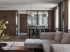 Помещение разделено на две равные половины. Первая - это столовая, гостиная и кухня, а также гардероб и гостевой санузел. Вторая - приватная часть с двумя спальными комнатами и ванной. В пространстве между двумя частями квартиры логично расположились постирочная, бытовая комната и три гардеробных.