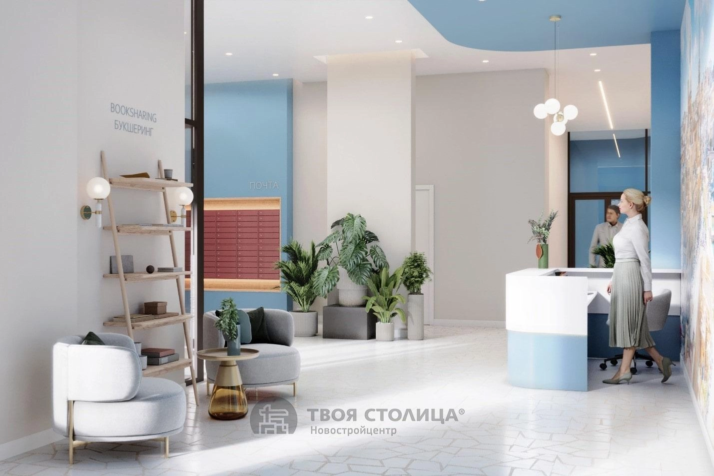 Дом с дизайнерским лобби со стеллажом для букшеринга. Здесь можно отдохнуть либо провести переговоры и встречи.