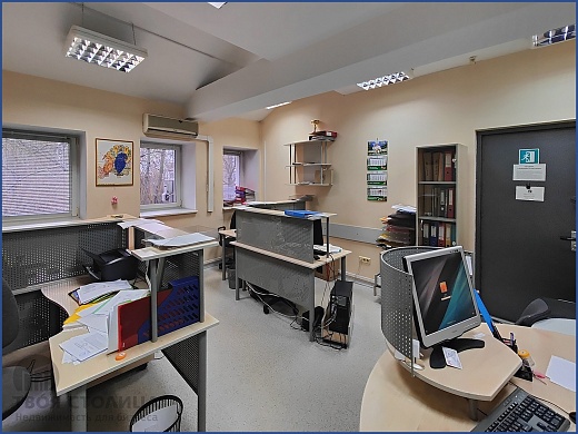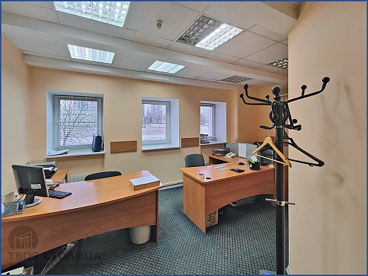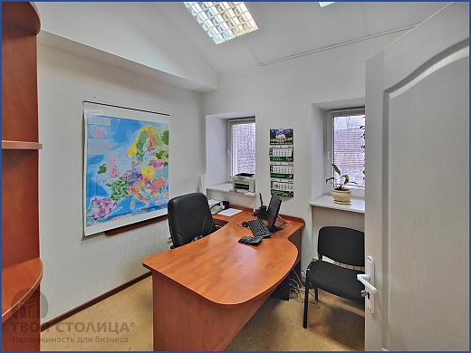 Площадь — 68.4 кв.м. Кабинетная планировка: 4 помещения с естественным освещением. В наличии отделка, мини-кухня, кондиционирование, отдельный вход. Санузел — на этаже. На фото мебель арендатора.