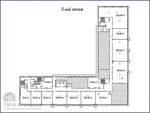 Административные помещения от одного этажа до целого здания. Площадь типового этажа 2676.5 кв.м. Формат – open space.