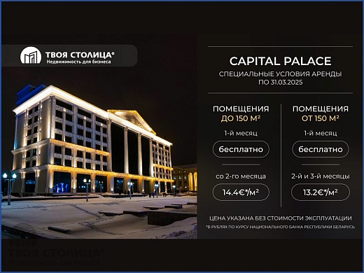 Многофункциональный комплекс класса «А» в центре столицы – BK Capital Palace, расположен на Октябрьской площади г. Минска – деловой и культурный центр города. Площадь бизнес-центра составляет 16908 кв.м.