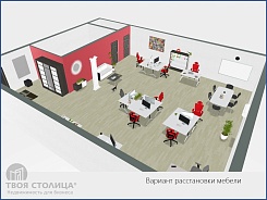 В предложении офисное помещение на втором этаже - 171 кв.м. Имеется отдельный кабинет и мини кухня.