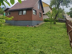 Двухуровневый дом из бревна, крыша черепица. Входная металлическая дверь. Две  комнаты и кухня. На первом этаже кухня и гостиная, на втором одна  спальня. Напольное покрытие-ламинат. В оконных проемах стеклопакеты ПВХ. В дом введен водопровод , подогрев электробойлером. Душевая кабина. Отвод воды в местную канализацию из дома.  Обогрев дома осуществляется печью. Капитальная деревянная лестница.  Участок 5 соток в частной собственности.  Участок огражден. Парковочное место для автомобиля.  Хозблок. Плодово-ягодные и декоративные насаждения.  Детская горка. Беседка. Мангал.