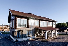 Элитный коттедж из бруса с монолитным цокольным этажом, облицованным диким камнем.