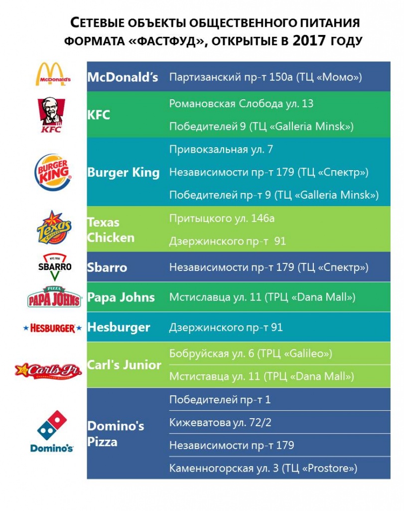 Если говорить в общем о сцене столичного фастфуда, то в последние несколько лет на ней можно наблюдать очень бурное развитие. Самым прорывным годом можно назвать 2015 г., когда в столице открылись рестораны «вкусной курочки» (KFC), поклонников «готовки на огне» (Burger King), а также целых три пицца-фуда: Sbarro, Domino’s Pizza и Папа Джонс. Что касается текущего года, то по данным отдела консалтинга и аналитики Группы компаний «ТВОЯ СТОЛИЦА», только за 8 месяцев 2017 года в столице было открыто 17 объектов различный «сетей»: McDonald’s, KFC, Burger King, Texas Chicken, Sbarro, Hesburger и Carls Junior. Причем сети Hesburger и Carls Junior в 2017 году открыли в Минске свои первые объекты.