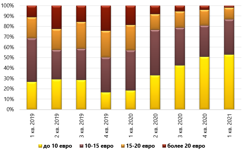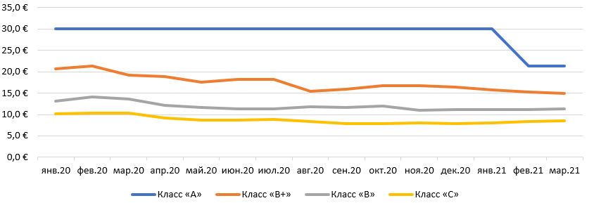 - класс «А» 21,3 EUR с НДС (-29% по сравнению с летом 2020);