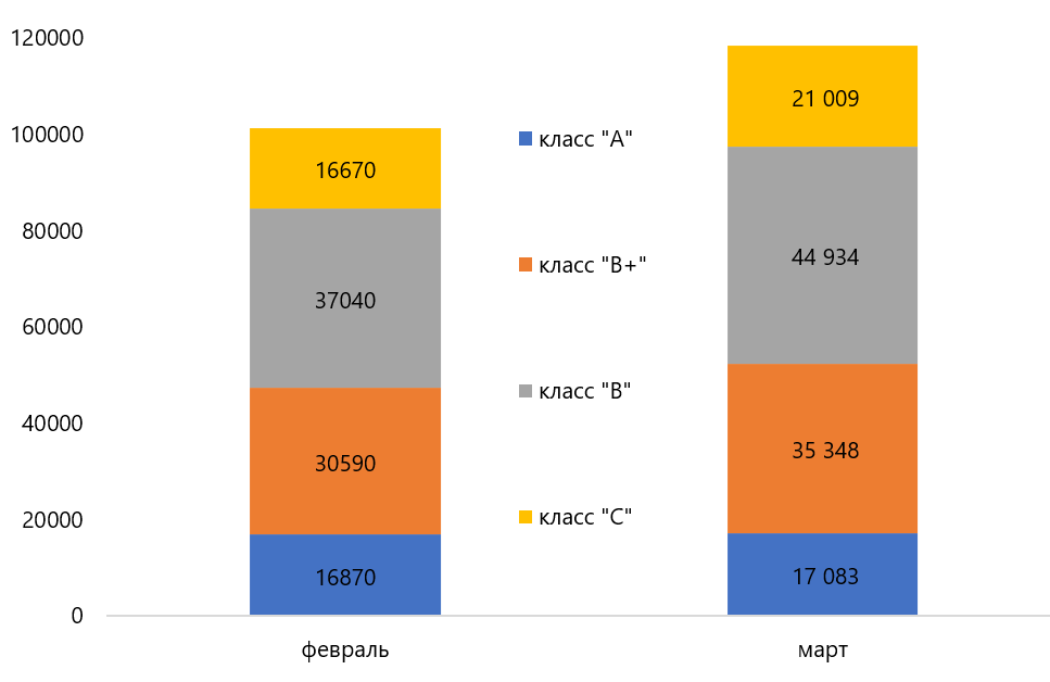 Структура вакантных в аренду площадей в бизнес-центрах г. Минска в феврале и марте 2021 г.