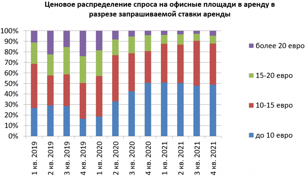 Ценовое распределение спроса на офисные площади в аренду в разрезе запрашиваемой ставки аренды следующее: