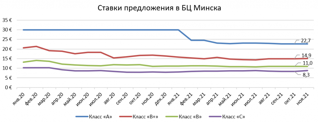 На начало декабря объем предлагающихся в аренду офисных площадей в бизнес-центрах Минска составлял 112,7 тыс. кв. м. По сравнению с данными на начало июля, вакантность существенно не изменилась и осталась на том же уровне.