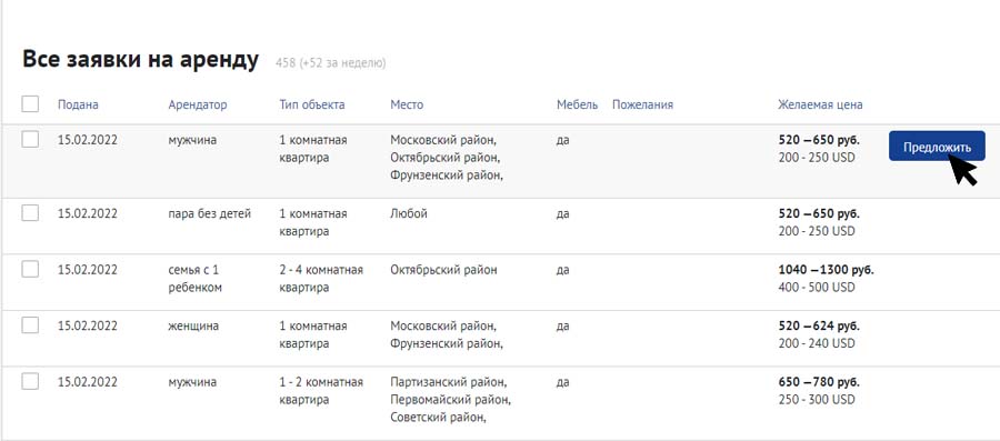 Вы выбираете себе арендатора кнопкой «Предложить». Можно предложить свою недвижимость нескольким потенциальным арендаторам, чтобы увеличить шанс сдать квартиру уже сегодня – нет какого-либо лимита! После оставленных Вами предложений на сдачу квартиры, специалисты предложат её именно тем арендаторам, которых Вы выбрали.