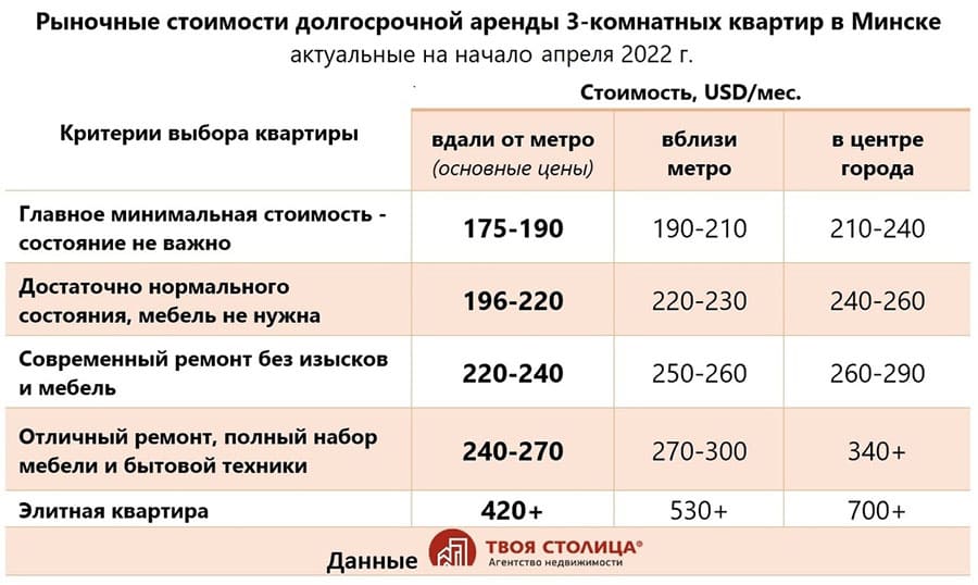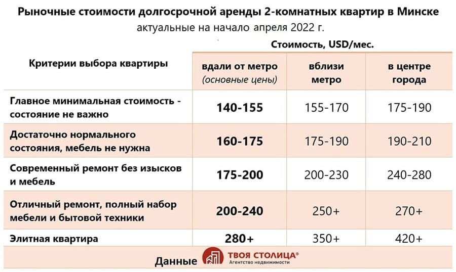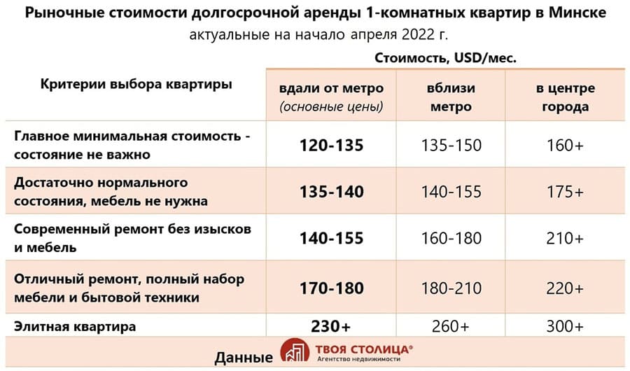 Татьяне тоже не на что жаловаться: «И в прошлом месяце, и в этом считаю сумму по курсу, который был до 24 февраля. То есть по 2,6 рубля. Хозяин квартиры охотно пошел навстречу. Правда, когда доллар был почти по 4 рубля, просил рассчитываться хоть и по старому курсу, но в у. е. А в апреле сказал, что может принять и в белорусских. Конечно, расклад зависит от хозяина, а не от квартиры. Но чтобы вы понимали, арендую я однушку на улице Ангарской, это в трех остановках от метро „Могилевская“. Ремонт нормальный, современный, не „бабушатник“. Есть необходимая бытовая техника. Единственное, вся мебель (кроме шкафа) наша. Стоила эта квартира $250, в договоре прописана сумма в 615 рублей. По факту сейчас плачу 650».