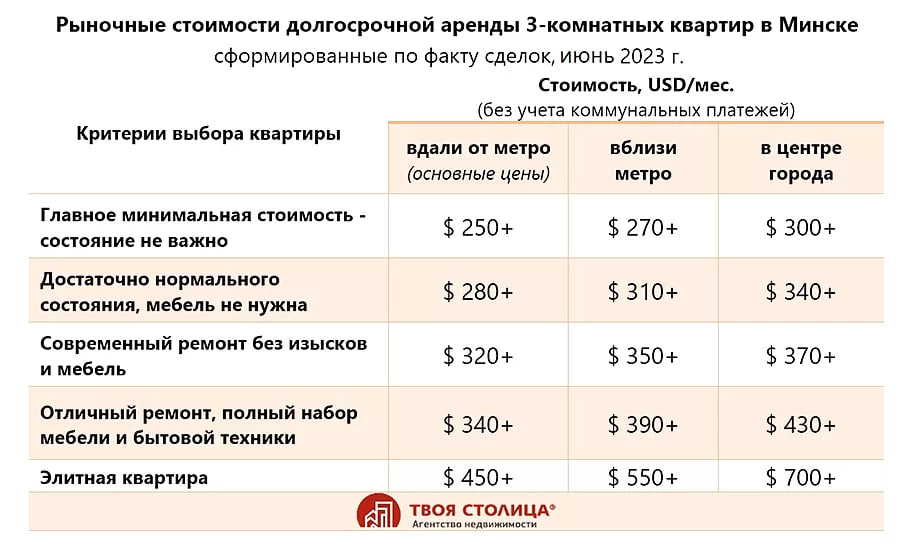 Если потенциальный арендатор строит запрос в ключе «нормальное состояние, мебель не нужна» ‒ стоимость начинается от 170 долларов. Возле метро ‒ +20 долларов, в центре Минска ‒ +30 долларов.