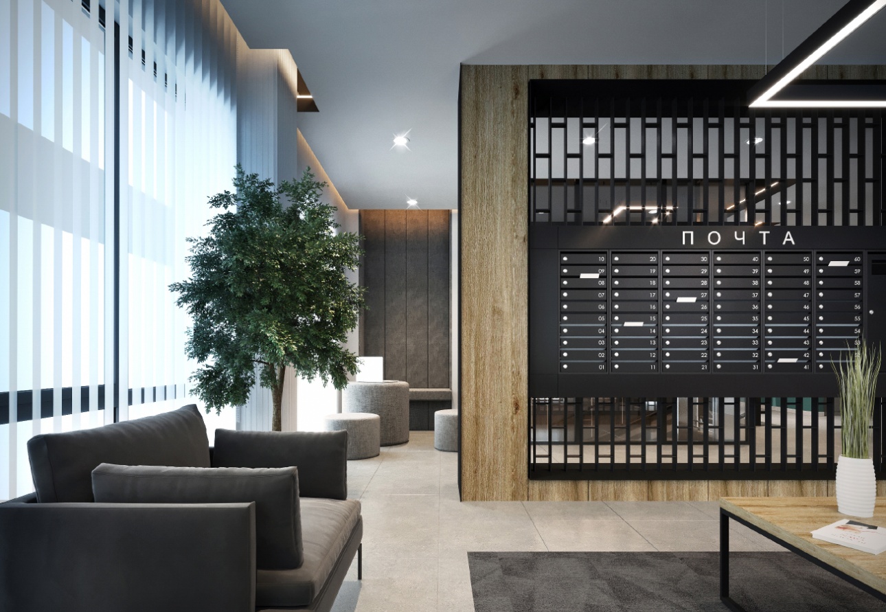 Центральное место этой зоны отдано под стену с почтовыми ящиками, вокруг которой выстраивалось остальное пространство. С одной стороны – консьерж-сервис, с другой – зона отдыха, в которой мы оборудовали полки для кроссбукинга и отдельный «айти-уголок» с розетками и вай-фаем, в котором можно спокойно посидеть с компьютером одному или с кем-то встретиться.