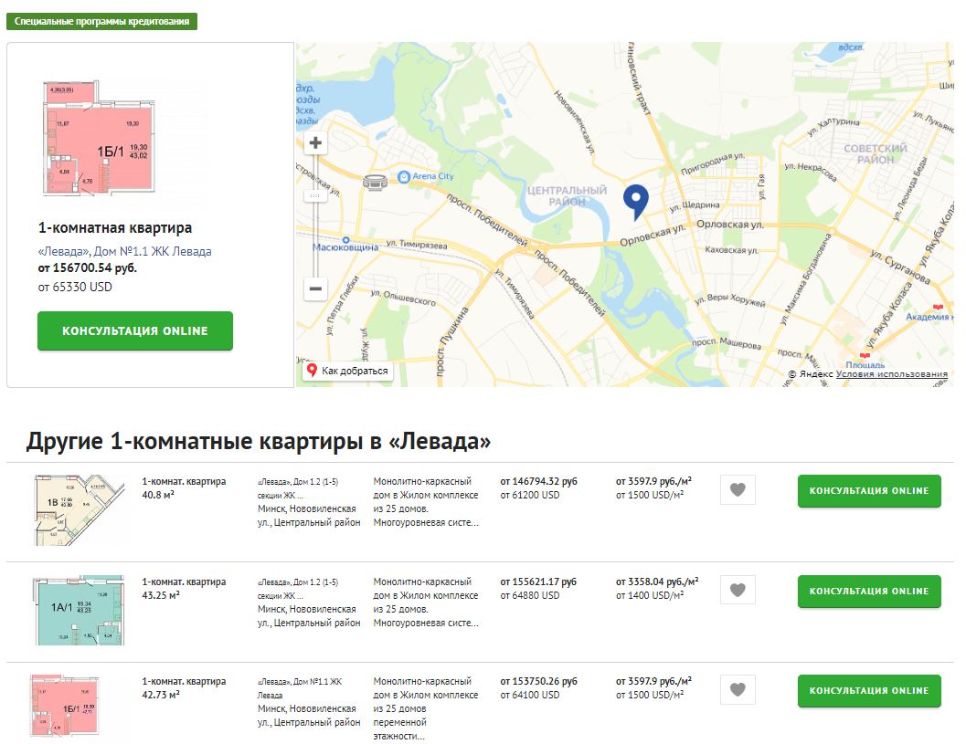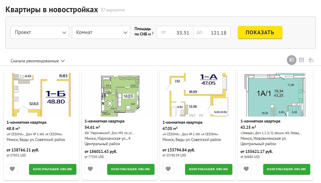 Квартиры в новостройках собраны в одном разделе, где представлена информация о конкретных квартирах, их стоимости, планировках и характеристиках. Необходимо ввести в фильтр параметры, по которым подбирается квартира. Список подходящих вариантов, – результат оnline-подбора.