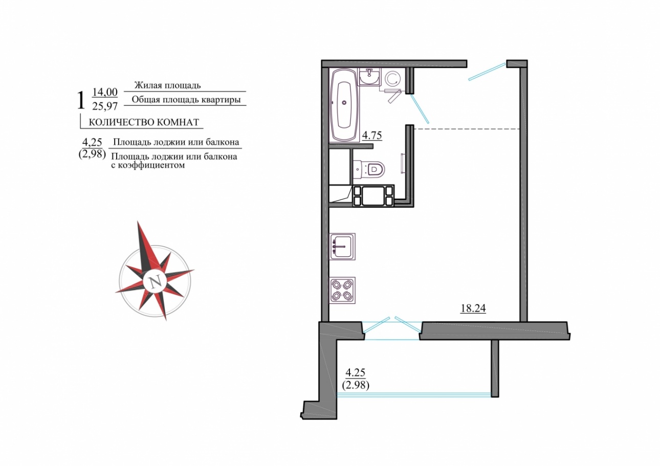 - квартиры-студии общей площадью 26 квадратных метров,