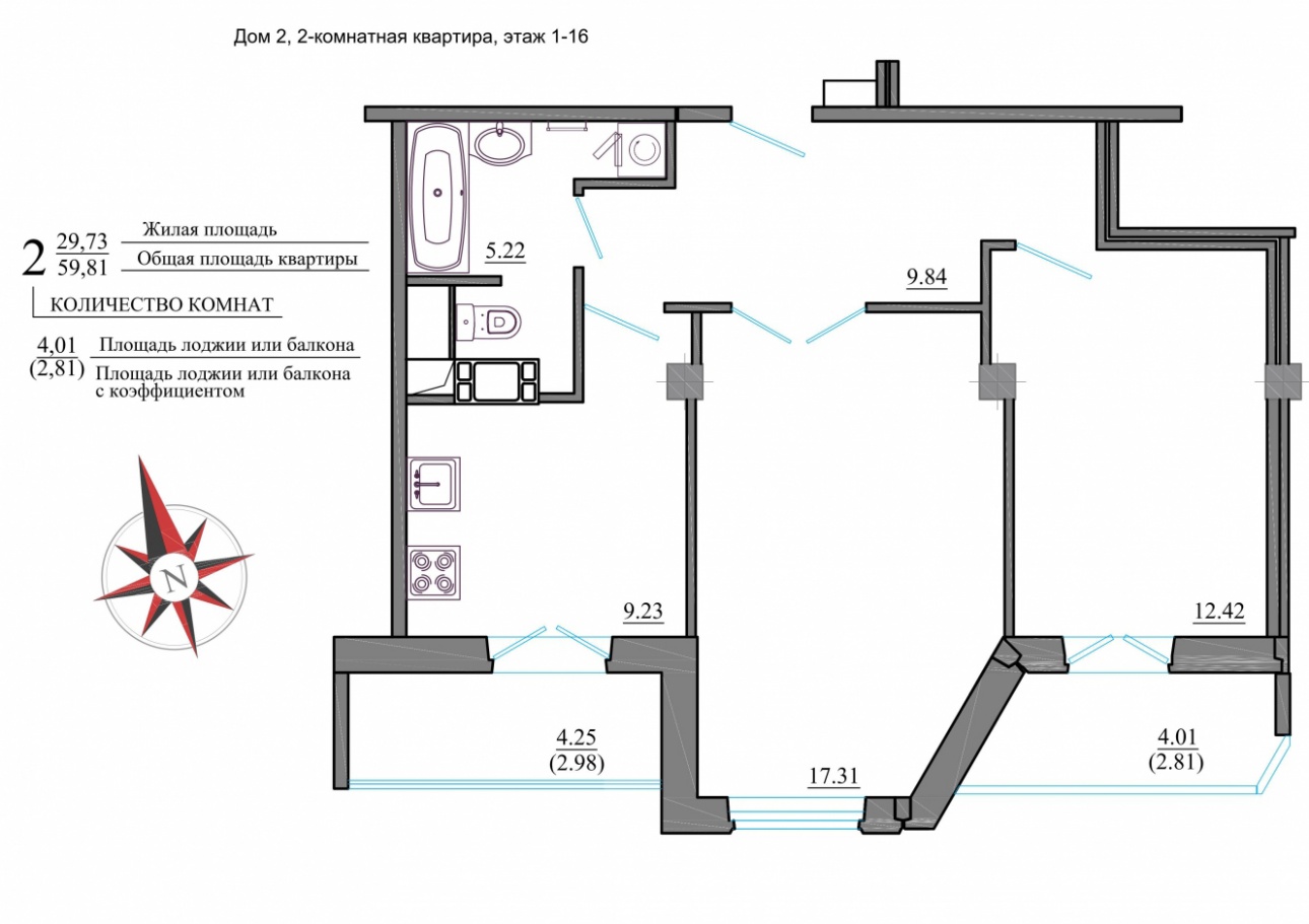 - 2-комнатные квартиры общей площадью 59,8-62 квадратных метров,