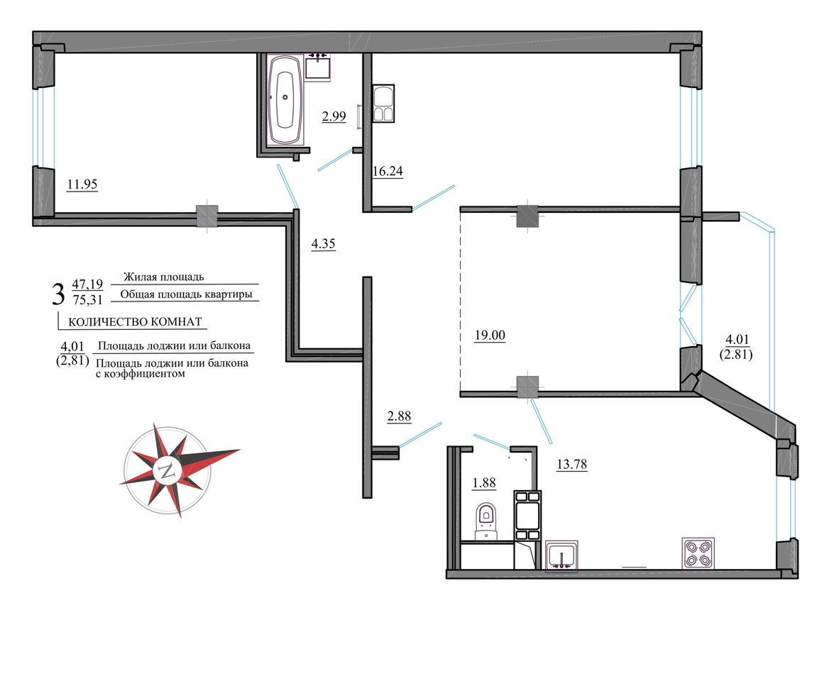- 3-комнатные квартиры общей площадью 75 квадратных метров.