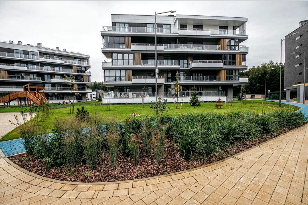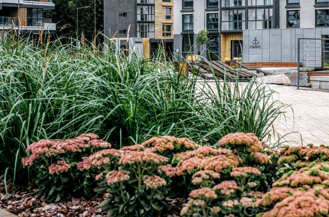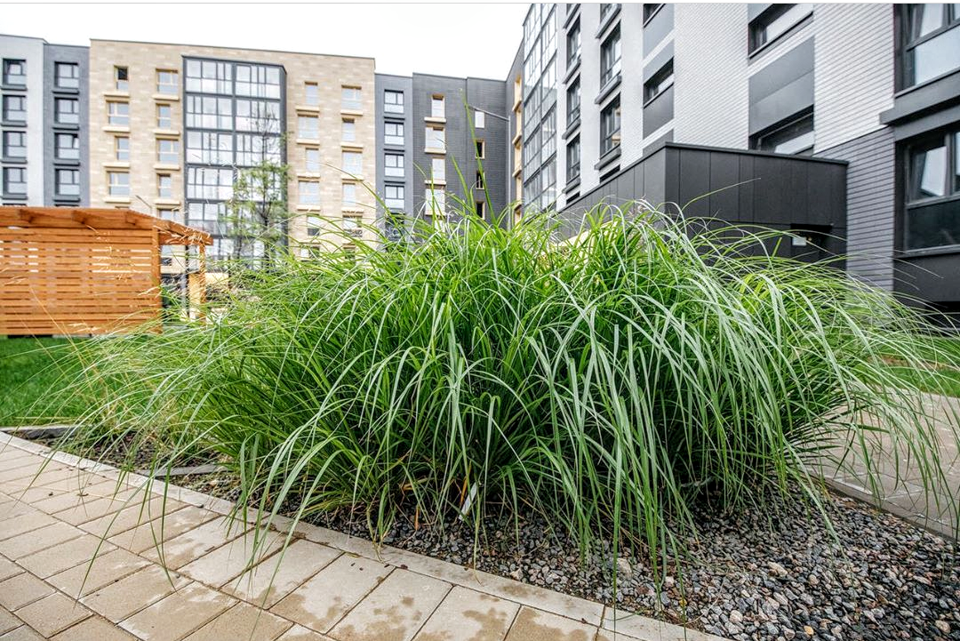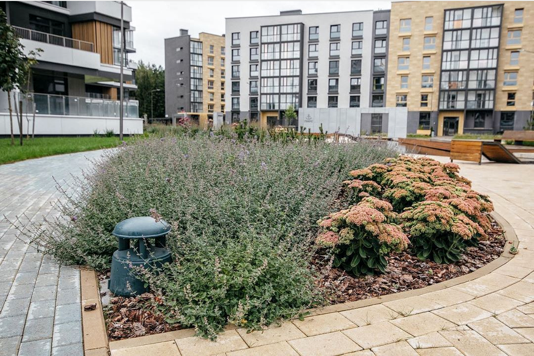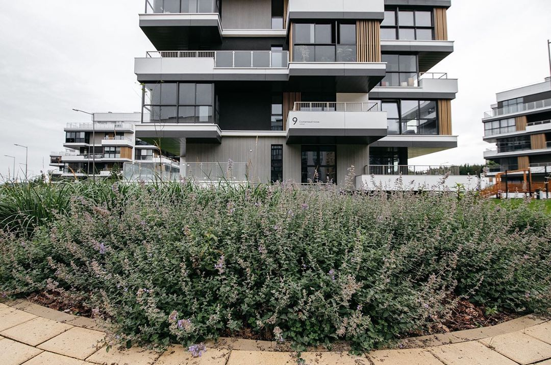 Стилистика цветников лёгкая, ажурная, подвижная и шуршащая на ветру. Ландшафтные дизайнеры поддержали современную архитектуру квартала прибалтийским пейзажем, оформив территорию у домов максимально, природно и натуралистично.