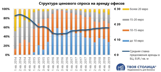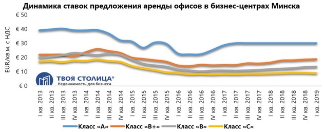 К 2017-му году ситуация стабилизировалась. Как и валютный курс - ключевой фактор, влияющий на цены и ставки, поскольку подавляющее большинство компаний получали доходы в белорусских рублях, а значит рост валют увеличивал для них стоимость аренды / покупки. Кроме того, ввиду уменьшившихся объемов ввода новых бизнес-центров, стал формироваться дефицит предложения. Свободные на то время офисные площади быстро заняли и в 2018 г. уже можно было говорить о формировании дефицита офисов площадью 500+ кв. м.