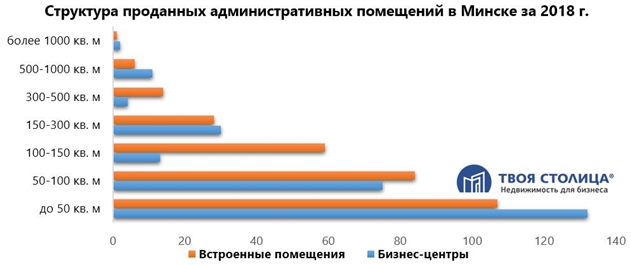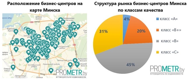 Преобладающая доля офисов располагается в бизнес-центрах, под которыми, согласно классификации бизнес-центров, разработанной «Твоей столицей» для Минска в 2016 г., понимаются объекты недвижимости, введенные в эксплуатацию с 1996 года, офисная площадь которых составляет более 3 000 кв. м. В то время как доля офисных помещений среди встроенных коммерческих помещений - очень мала, поскольку преобладающее большинство встроенных помещений используется в качестве торговых или оказания услуг.