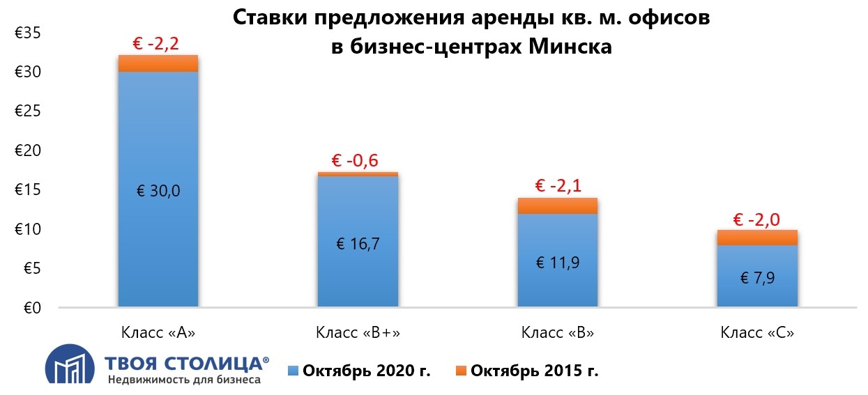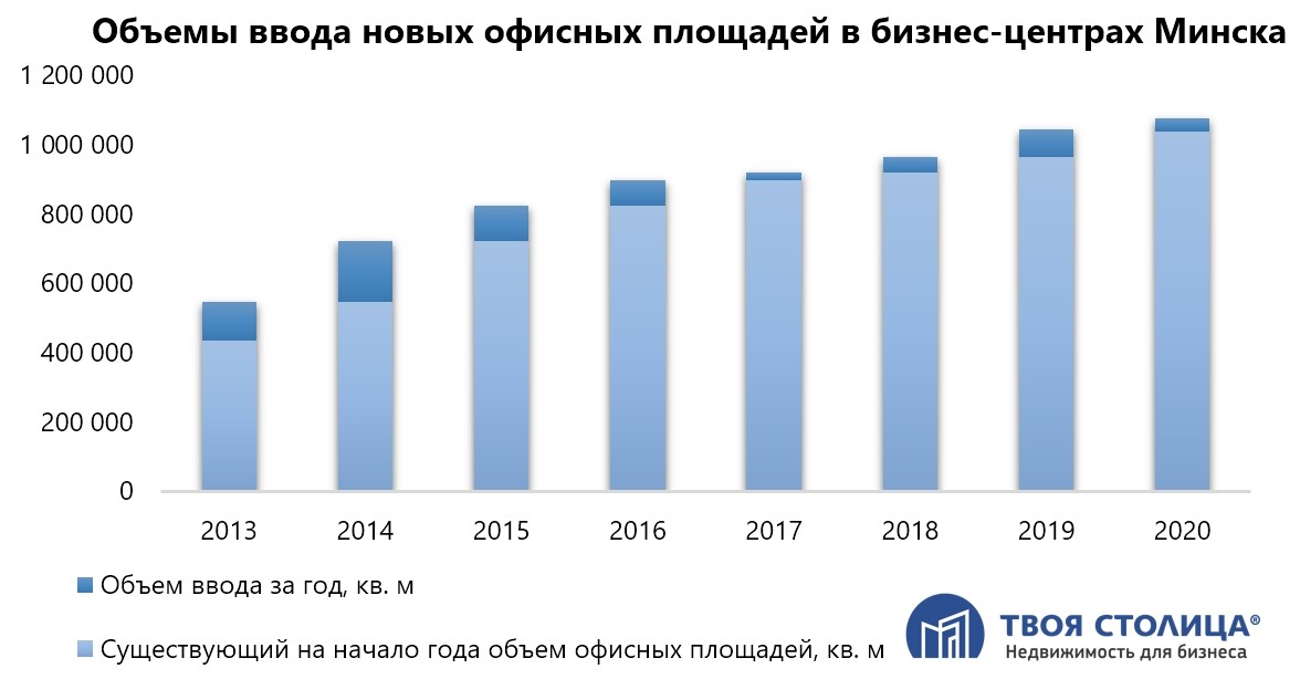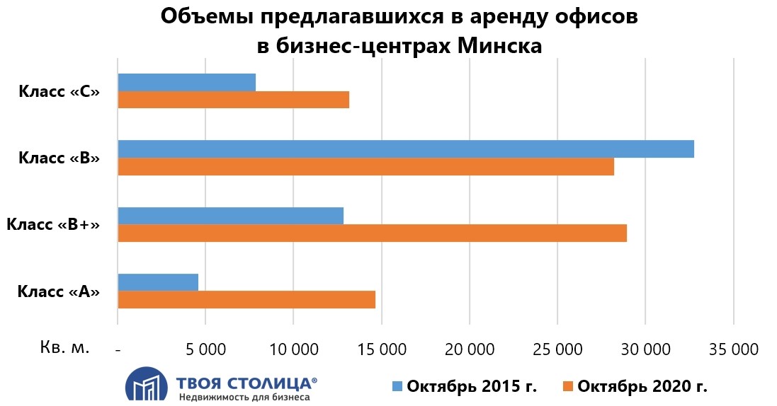 В начале 2015 года в Минске были 87 бизнес-центров, совокупной офисной площадью 721 тыс. кв. м, а к концу года их количество уже увеличилось до 103 и более чем 824 тыс. офисных кв. м.