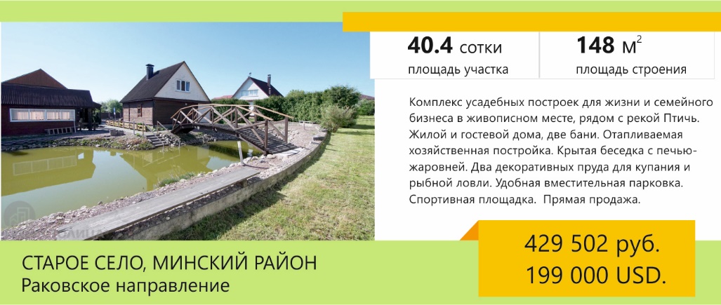 Для тех любителей воды , которые могут воспользоваться собственными водоемами для купания и рыбной ловли- все зависит от желания и наличия свободного времени. Покупателю самого интересного предложения в этом сегменте будет доступен комплекс построек, пригодных как для проживания, так и для ведения бизнеса. Живописные виды, рядом Птичь- отличный повод выбрать дом в местечке Старое Село.