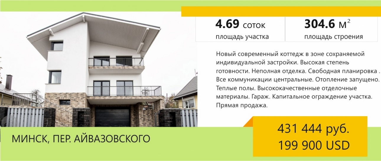 Новый добротный коттедж под финишную отделку в зеленой зоне Минска , недалеко от реки Свислочь, район Западный поселок продается за 431 444 BYN. На берегу реки уже планируется расширение зоны отдыха и создание парковой территории, ведутся соответствующие работы. Что касается дома по пер. Айвазовского, то все «влажные», наиболее хлопотные отделочные работы здесь закончены. Новый хозяин имеет возможность привнести свое видение уюта и комфорта.