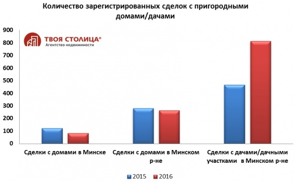Спрос на загородные дома/дачи есть, но он постоянно ослабевает и переориентируется. Например, в последние годы идет переориентация с домов на дачи в целях минимизации стоимости приобретения. Прямое следствие этого – снижение спросовых заявок на покупку домов в Минске и его самом ближнем пригороде за 2016 год на 20%. А объем предложения наоборот вырос на 10%.
