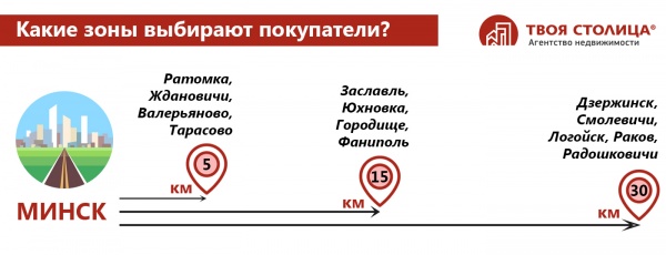 На основании типовых запросов покупателей и территориального расположения населенных пунктов в окружении Минска, можно выделить 3 своего рода зоны интереса покупателей: до 5 км, порядка 15 км и 30 км от МКАД.