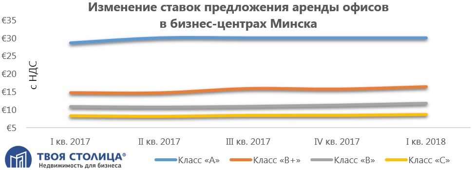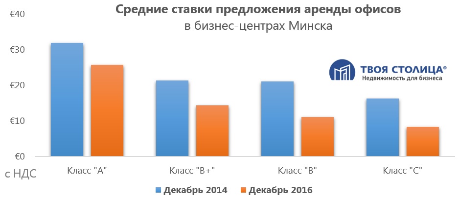 Если бы не очередная волна кризиса, которая накатила в 2015 г., то возможно столь значительного снижения цен и ставок аренды, не было. А так – за 2015-2016 гг. проседание по рынку, в зависимости от класса качества, составило от 20% до 50%. Сильнее всего подешевели офисы класса «С» - средняя ставка предложения в декабре 2014 г. составляла 15-16 EUR/кв. м. с НДС, а в декабре 2016 г. – уже 7-8 EUR/кв. м. с НДС.